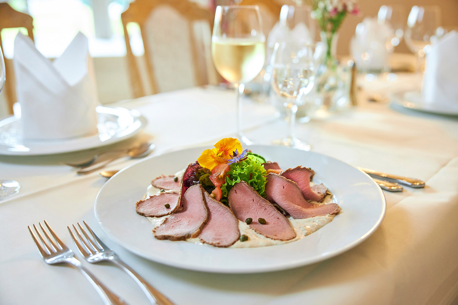 In unserer Küche werden vorrangig frische Produkte, gerne aus der Region, verarbeitet. Wir kochen mit Hand und Herz und haben uns der frischen deutschen Küche verschrieben. Natürlich gibt es auch Holsteiner Spezialitäten wie Sauerfleisch mit deftigen Bratkartoffeln und Matjes. Auch Vegetarier, Veganer und Allergiker kommen in unserem Restaurant voll auf ihre Kosten – wir gehen gerne auf individuelle Wünsche ein. Je nach Jahreszeit ergänzen wir unsere Speisekarte um saisonale Gerichte – von Spargel im Frühling über frischen Fisch und leichte Sommergerichte bis hin zu Wild und Grünkohl im Herbst und Winter. Ob am kuscheligen Kamin, im lichtdurchfluteten Wintergarten oder auf der sonnigen Terrasse – bei uns finden Sie immer das passende Plätzchen zum Genießen.