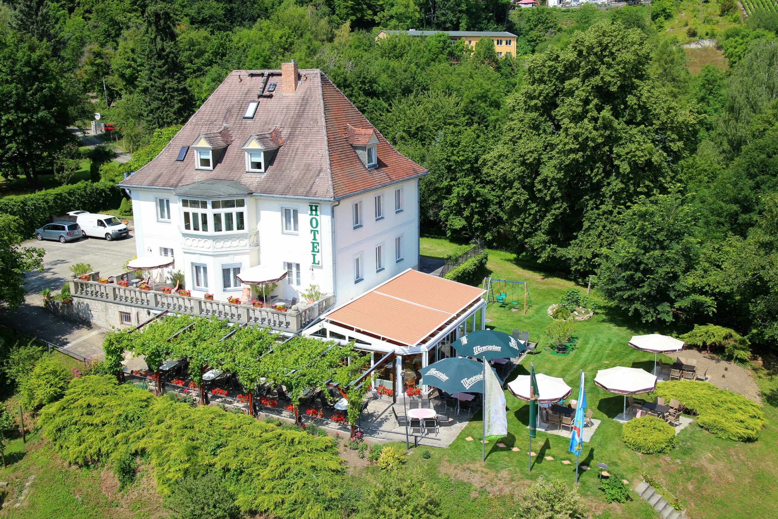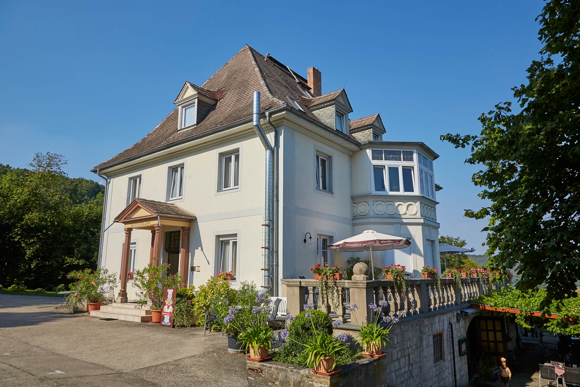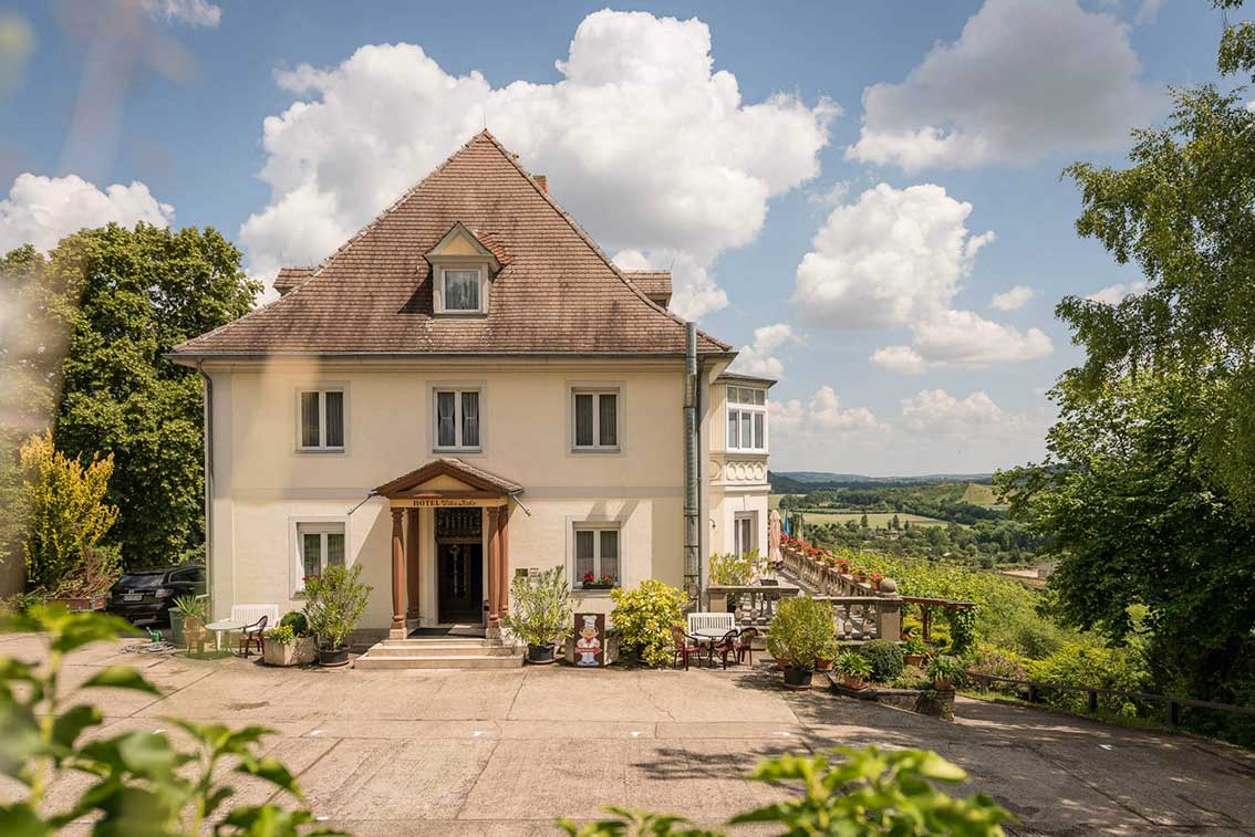 Unser denkmalgeschütztes Haus im Jugendstil ist von einem riesigen Wald- und Weingarten umgeben und bietet einen guten Ausgangspunkt für Wander-, Rad- und Bootstouren. Im Wintergarten-Restaurant servieren wir Ihnen moderne, regionale Speisen zu Saale-Unstrut Weinen, u.a. aus eigenem Anbau. Auf unserer Außenterrasse genießen Sie einen einmalig schönen Blick auf das Saaletal. Für Familienfeiern oder Tagungen empfehlen wir unser kleines, feines Tagungsgebäude – das Weinberghaus.