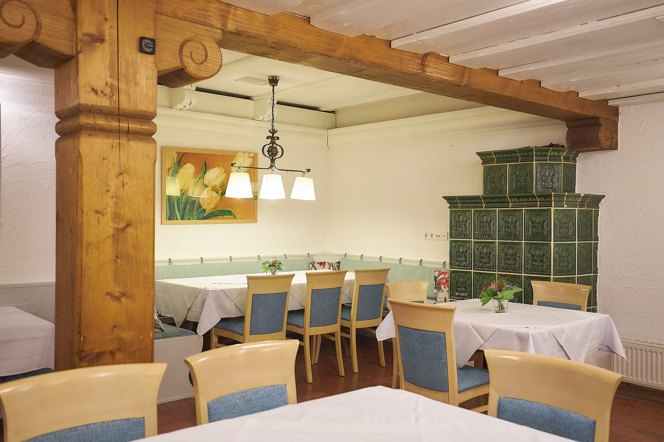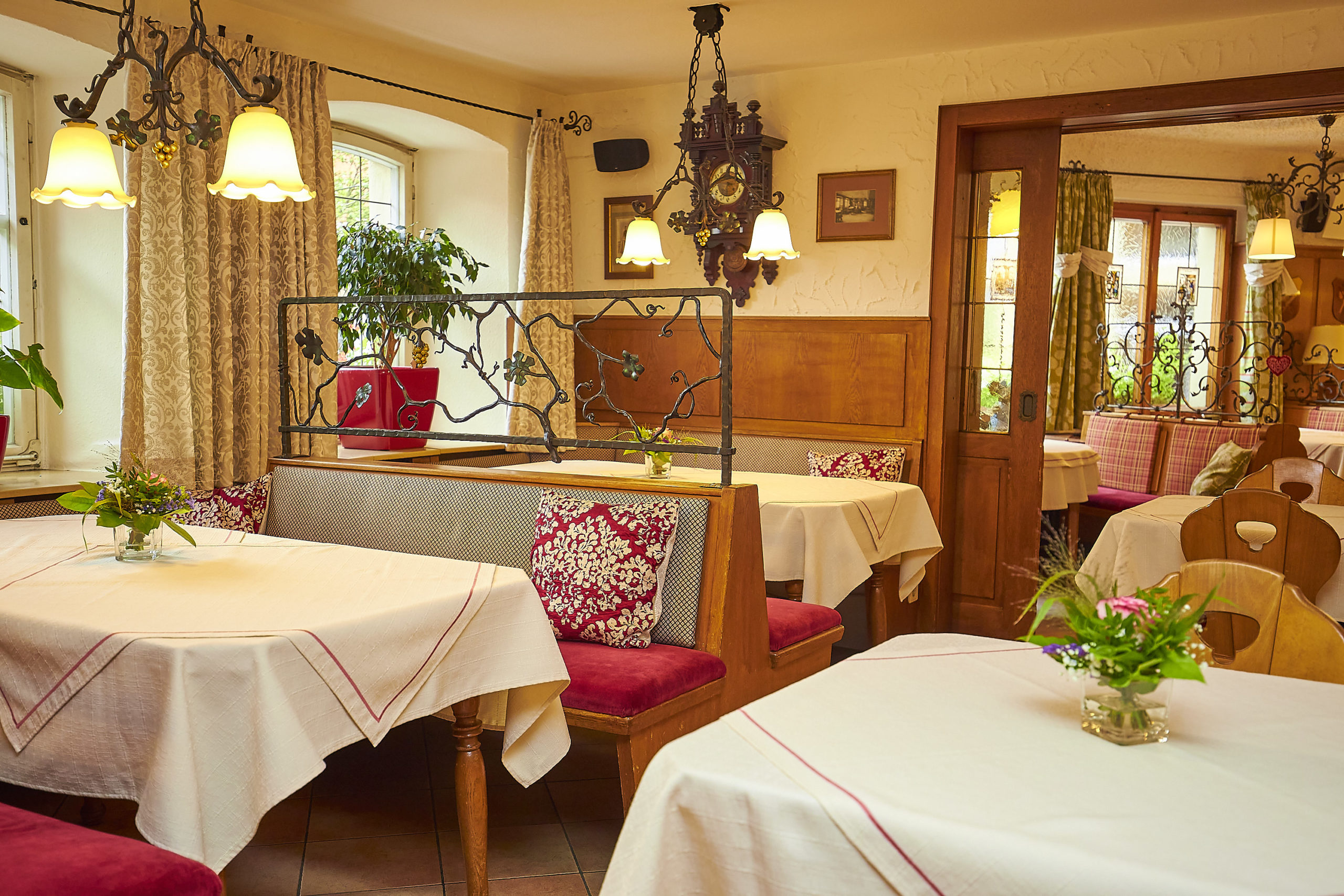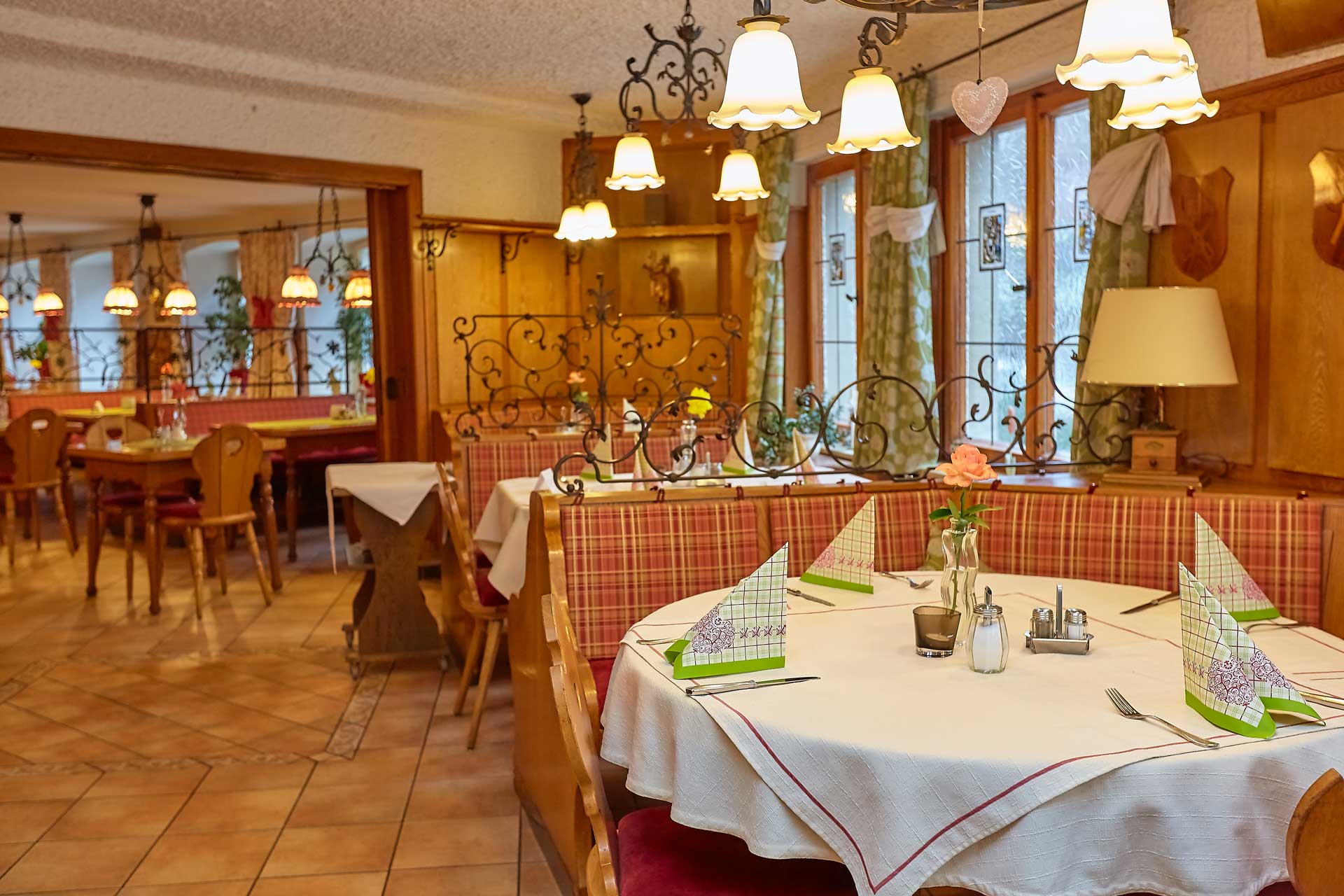 Im Restaurant des Hauses bietet das Team Ihnen eine große Auswahl regionaler und deutscher Gerichte. Bevorzugt werden Produkte aus der Region verwendet. Kräuter und Salat kommen aus dem eigenen Garten, auch Schinken und Wurst stammen aus eigener Herstellung. Hier ist die Küche noch echtes Traditionshandwerk. Weine und Bier kommen ausschließlich aus der fränkischen Heimat. Im Sommer können Sie die Gerichte auf der romantischen Terrasse genießen.